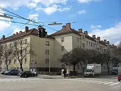 Die ursprünglich an der Südseite der Troststraße vorhandenen Kleingartenanlagen und Gärtnereien befanden sich zum Teil auf einem Areal der Waffenfabriksgesellschaft Steyr-Daimler-Puch. Dort entstand ab 1939 ein Wohnblock mit Kleinwohnungen (bis maximal ~55 m²). Im Keller wurden schon bei Baubeginn Luftschutzräume eingeplant, die erst 1958 zu Kellerabteilen für die Hausparteien umgewandelt wurden.
