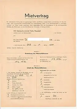 - ↑ Hartmut Häußermann, Walter Siebel: Soziologie des Wohnens. Eine Einführung in Wandel und Ausdifferenzierung des Wohnens. Weinheim 1996, S. 168; festgelegt in der Verordnung über die Lenkung des Wohnraums vom 14. September 1967 (GBl. I Nr. 105 S. 733) in Kraft ab dem 1. Januar 1968 – Wohnraumlenkungsverordnung.