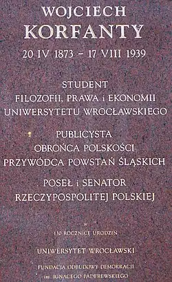 Wojciech Korfanty, geboren als Adalbert Korfanty (* 20. April 1873 in der Kolonie Sadzawki bei Siemianowitz/Laurahütte (Deutsches Kaiserreich); † 17. August 1939 in Warschau (Zweite Polnische Republik)) war ein polnischer Journalist, Mitglied des Deutschen Reichstages und Abgeordneter des Sejms.