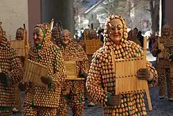 Gelb-blaue Schellenhansel und schwarze Röslehansel beim Umzug