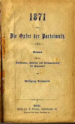 - 1871 oder Die Opfer der Parteiwuth. Roman aus der Diplomaten-, Jesuiten- und Freimaurerwelt der Gegenwart. Döring, Berlin (ohne Jahr)[5]