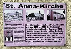 Infotafel von 2014 an der St.-Anna-Kirche in Misburg mit erfundenen Geschichts­informationen (Bild Juni 2025)
