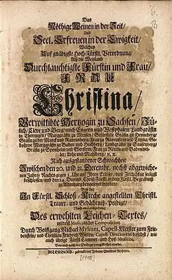 - Das Nöthige Weinen in der Zeit Und Seel. Erfreuen in der Ewigkeit ... : ... Alß die Weyland ... Frau Christina, Verwittibte Hertzogin zu Sachsen, ... Zwischen den 20. und 21. Decembr. ... Nachts gegen 1. Uhr ... diese Zeitlichkeit seeligst beschlossen, und den 24. Decemb. ... in dem Fürstl. Begräbniß zu Altenburg beygesetzet worden, Bey der ... Christl. Trauer- und Gedächtniß-Predigt ... mittelstMusicalischer Composition durch Wolffgang Michael Mylium ... wie auch übrige Fürstl. Cammer- und Hof-Musicos ... Vor- und nach der Predigt vorgestellet wurde Altenburg, 1706.