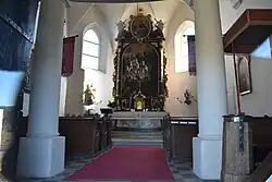 Der Hochaltar aus dem zweiten Viertel des 17. Jahrhunderts zeigt das Hochaltarbild des hl. Wolfgang aus 1711 mit vier weiteren Heiligen und der Gottesmutter. Die Wappenkartusche bez. 1675 wurde wohl später angebracht. Es gibt zwei große gedrechselte Wandlungsleuchter und ein Kommuniongitter aus dem 18. Jahrhundert.