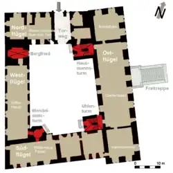 Heutiger Grundriss der Wolfsburg (Türme rot)