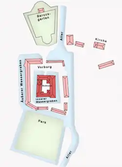 Wegen ihrer Lage in der Allerniederung war die Burg wahrscheinlich schon zur Anfangszeit von Wasser umgeben. Bis ins 19. Jahrhundert schützten sie zwei Wassergräben, die von der nahe liegenden Aller und dem Hasselbach gespeist wurden. Der innere Wassergraben umschloss unmittelbar die Burg, was sie in Verbindung mit Zugbrücken zu einer Wasserburg machte. Um das Jahr 2002 wurde der innere, im 19. Jahrhundert verfüllte Wassergraben an mehreren Stellen archäologisch untersucht. Es fanden sich Reste der Einfassungsmauer des Grabens bis zu einer Tiefe von 2,6 Meter. Nach den Untersuchungen wurden die Mauer und der Graben an der Oberfläche durch Pflasterungen und Schotter dargestellt, so dass der frühere Grabenverlauf rings um das Schloss optisch sichtbar ist. Außerdem blieb der Wassergraben im Bereich einer Mauerecke in einer Größe von 3,5 × 3,5 Meter offen stehen und wurde mit einer begehbaren Glasfläche überdacht.[9]