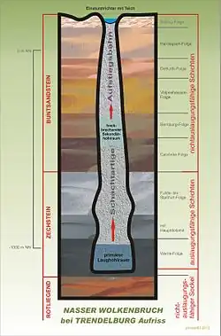 Vor rund 250 Millionen Jahren[2] mit Beginn des Erdmittelalters lagerten sich auf dem Zechstein allmählich rot gefärbte Sedimente und Sedimentgesteine in einer Mächtigkeit von weit mehr als 1000 m[2] ab und verfestigten sich vorwiegend zu Sandsteinen. Um die Zeitenwende zur Erdneuzeit vor etwa 65,5 Millionen Jahren wurden diese Ablagerungen bis zum Mittleren Buntsandstein abgetragen.
