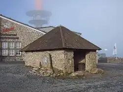 Wolkenhäuschen auf dem Brocken; links die Goethe-Tafel; im Hintergrund Brockenhotel und Funkmast
