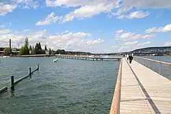 - Am 1. Mai 2015 wurde als Teil des Seeuferwegs der Cassiopeiasteg eröffnet.[19] Der 284 Meter lange und 2,8 Meter breite Steg beginnt bei der Roten Fabrik, führt 100 Meter in den See hinaus, um das Strandbad Wollishofen herum und endet beim Hafen Wollishofen. Benannt ist er nach dem Sternbild Cassiopeia.[20]