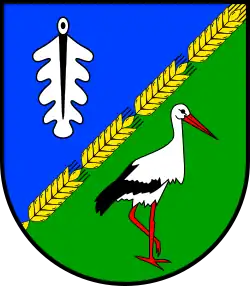 Blasonierung: „Von Blau und Grün durch einen aus vier goldenen Ähren gebildeten Balken schräglinks geteilt. Oben ein silbernes Eichenblatt mit nach unten weisender Blattspitze, unten ein natürlich tingierter, links gewendeter Storch.“[4]
