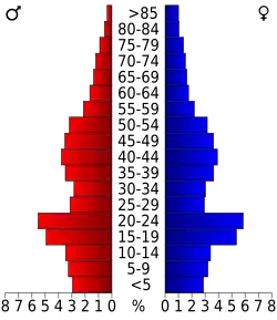 Auf das gesamte County bezogen setzte sich die Bevölkerung zusammen aus 23,7 Prozent Einwohnern unter 18 Jahren, 17,2 Prozent zwischen 18 und 24 Jahren, 26,8 Prozent zwischen 25 und 44 Jahren, 21,3 Prozent zwischen 45 und 64 Jahren und 11,0 Prozent waren 65 Jahre alt oder darüber. Das Durchschnittsalter betrug 33 Jahre. Auf 100 weibliche Personen kamen 93,8 männliche Personen. Auf 100 Frauen im Alter von 18 Jahren oder darüber kamen statistisch 91,1 Männer.
