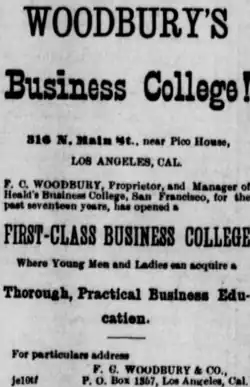 1884 gründete der Pädagoge und Unternehmer Francis Chute Woodbury (1841–1898),[1] ein Pionier der Koedukation, das Woodbury College (Woodbury’s Business College), ein College für kaufmännische und Büroberufe, die zweitälteste höhere Lehranstalt in Los Angeles. Bis 1891 war Woodbury Eigentümer und Leiter der Schule, die an der South Spring Street 226 ihren Sitz hatte.