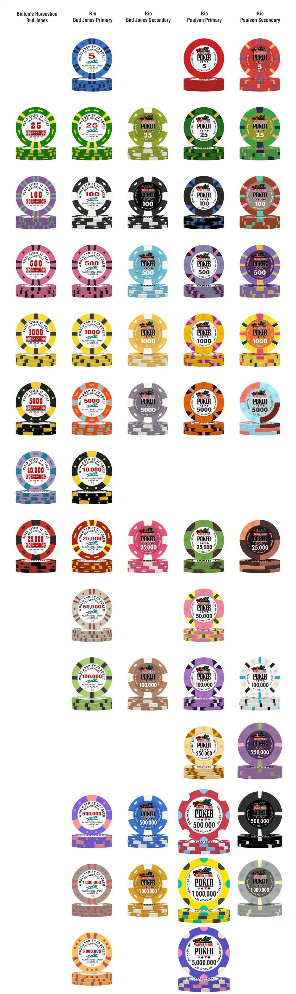 Für die WSOP 2004 wurden als Turnierchips erstmals eine exklusiv hergestellte Serie eingesetzt, zuvor wurde mit hauseigenen Chips des Horseshoe Casinos gespielt. Diese wurde vom Unternehmen Bud Jones produziert und hatten die Wertigkeiten 25, 100, 500, 1000, 5000, 10.000 und 25.000. Nachdem die WSOP im Jahr 2005 den Standort ins Rio gewechselt hatte, wurde das Design der Chips aus dem Horseshoe weitestgehend übernommen, nicht jedoch die Chips selbst, wodurch eine neue Serie produziert und in den folgenden zwei Jahren nochmals erweitert (u. a. mit einem Sekundärset) bzw. angepasst (Farbgebung, redundante Werte) wurde. Der höchste Wert in dieser Serie war der 100.000er-Chip. Im Jahr 2007 wurde der Chip-Produzent Paulson mit der Herstellung der neuen Serie beauftragt und damit ein komplett neues Primärset ins Spiel gebracht, inklusive eines Sekundärsets für Nebenevents. Auch wurden zuweilen noch Chips der Serie von Bud Jones verwendet. Durch die steigenden Teilnehmerzahlen mussten immer höhere Werte eingeführt werden. Der aktuell höchste Wert ist der 5.000.000er-Chip.[20] Verwendete Stückelungen und Farbgebungen einzelner Werte wechseln immer wieder aufgrund von Entscheidungen der Turnierleitung oder Rückmeldungen der Spieler. Im Jahr 2017 waren während des Main Events 245.514 Jetons im Umlauf.[21]