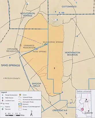 - ↑ Weepah Spring Wilderness & Worthington Mountains Wilderness: Wilderness Management Plan and Environmental Assessment, S. 3; Archivierte Kopie ( des vom 22. Februar 2017 im Internet Archive) Info: Der Archivlink wurde automatisch eingesetzt und noch nicht geprüft. Bitte prüfe Original- und Archivlink gemäß Anleitung und entferne dann diesen Hinweis., abgerufen am 1. März 2017.