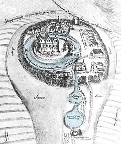 Das Schloss besaß auf der heutigen Hofseite anfangs zwei Giardino segreto. Der barocke Hauptgarten erstreckte sich in der Mittelachse des Schlossgebäudes nach Osten. Er war ein überwiegend nach französischen Vorbildern gestaltetes Parterre, das etwa die Breite des heutigen Mittelbaus aufwies und von hoher Regelmäßigkeit war. Die Mitte des Parterres, das vom Schloss durch eine Graft getrennt wurde, bildete ein Brunnen oder ein kreisrunder Platz, der durch die steinerne Figur bzw. eine Vase geschmückt war. Eine schmale Brücke stellte die Verbindung zwischen Schloss und Garten her.