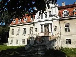 - Der angrenzende 5,5 Hektar große Schlosspark wurde im 19. Jahrhundert angelegt. Dieser besitzt zahlreiche exotische Baumsorten mit zahlreichen Naturdenkmälern.[7] Die Parkanlage steht seit 1988 unter Denkmalschutz.[8]