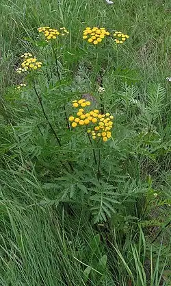 - Gemeiner Rainfarn (Tanacetum vulgare L., Syn.: Chrysanthemum vulgare (L.) Bernh. non Gaterau, Pyrethrum vulgare (L.) Boiss., Tanacetum boreale Fisch. ex DC.): Die etwa zwei Unterarten sind in Eurasien weitverbreitet[3] und ist in zahlreichen anderen Ländern ein Neophyt.[4]