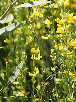 Die zwittrigen Blüten sind zygomorph und fünfzählig mit doppelter Blütenhülle. Der Kelch ist röhrig, glockig oder nahe der Spitze verengt. Die Kelchzähne sind gleich oder ungleich lang. Die fünf Kronblätter sind gelb (bei einigen Arten auch weißlich oder rötlich).