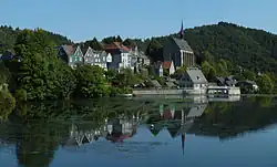 Die Topografie wird durch das Tal der Wupper geprägt, die sich rund 20 km durch das Stadtgebiet windet und deren steile Hänge oft bewaldet sind. Auf den nördlichen und südlichen Hochflächen gelegene Stadtteile gehen in die Wiesen und Wälder des Bergischen Landes über und machen Wuppertal, zusammen mit weitläufigen Grün- und Waldflächen wie etwa dem Barmer Wald, Scharpenacken oder dem Staatsforst Burgholz, zu einer „Großstadt im Grünen“. Als „Wiege der Industrialisierung in Deutschland“[5] ist die Stadt zugleich reich an großen Villenvierteln und Wohnhäusern aus der Gründerzeit: Etwa 4500 Baudenkmale befinden sich im Stadtgebiet.