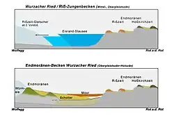 Bei der nächsten großen Eiszeit, der Würm-Kaltzeit, drang der Rheingletscher wieder weit ins Alpenvorland vor, sein größter Vorstoß und später ein erneuter Vorstoß, kamen jedoch vor dem Wurzacher Zungenbecken (also südlich des Zungenbeckens) zum Stehen. Beide Vorstöße bildeten wieder Endmoränen (Außenwall und Innenwall). Zwischen dem Außenwall des Würm-Gletschers und dem Innenwall des Riß-Gletschers war nunmehr eine komplett eingeschlossene Senke entstanden. Der Seewasserstand konnte nur noch durch die Abflussrinne der Wurzacher Ach reguliert werden. Aus dem Eisrand-Stausee der Riß-Kaltzeit war in der Würmzeit ein Endmoränen-Stausee geworden.[3] Schließlich drangen Schwimmblattpflanzen und Röhrichtpflanzen immer weiter in den See vor. Dieser verlandete und verkrautete postglazial (in der Warmzeit ab ca. 8 Tsd.) immer mehr und wurde dabei noch flacher und sauerstoffärmer.