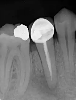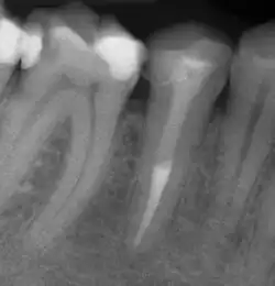 Zur Beurteilung des Erfolges einer Wurzelkanalbehandlung werden klinische Beschwerden, wie Schmerzen, Schwellungen oder Fistelgänge sowie der röntgenologische Befund herangezogen. Oft sind trotz endodontischer Infektion keine klinischen Beschwerden vorhanden, weshalb gerade die röntgenologische Kontrolle Hauptkriterium für die Beurteilung ist.[10] Neben der vorhandenen Wurzelfüllung und Veränderungen in der Wurzelphysiognomie (Resorptionen) wird vor allem der Zustand des periapikalen Gewebes begutachtet und auf das Vorhandensein einer Parodontitis apikalis oder einer radikulären Zyste geprüft.