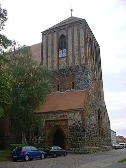 Die Kirche wurde Mitte des 13. Jahrhunderts aus Feldsteinquadern schon in gotischem Stil als einschiffige Kreuzkirche errichtet, später in Feldstein und Backstein zur spätgotischen Hallenkirche umgebaut. Einige mittelalterliche Fresken (u. a. einige Grotesken und Drolerien) sind erhalten. Sehenswert sind das Chorgestühl mit farbigen Reliefschnitzereien und das Triumphkreuz (um 1474), die Renaissancekanzel von 1610, der Barockaltar von 1769.[32] Die Orgel aus dem Jahre 1742 gehört zu den bis heute erhaltenen Orgeln des Berliner Orgelbauers Joachim Wagner (1690–1749), die in ihrem Pfeifenbestand in den vergangenen Jahrhunderten die wenigsten Veränderungen erfahren hat.