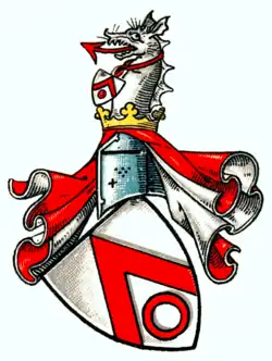 Das Stammwappen zeigt in Silber einen roten Sparren, der einen roten Ring einschließt. Auf dem gekrönten Helm ein wachsender silberner Drachenrumpf, der um den Hals ein rotes Band mit Ring trägt, von dem der verkleinerte Wappenschild herabhängt. Die Decken sind rot-silbern.