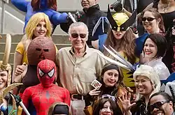 2012 posierte X-Men-Miterfinder Stan Lee (Mitte, unkostümiert) mit Cosplayern, die u. a. die X-Men-Figuren Juggernaut und Sabretooth (links) sowie Wolverine, Gambit und Storm (rechts) darstellen.