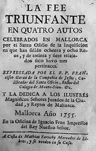 Im Zuge der Verurteilungen von 1691, publizierte Francesc Garau,[51] ein Jesuit, Theologe und aktiver Teilnehmer an den Inquisitionsprozessen, die Schrift La Fe Triunfante en quatro autos celebrados en Mallorca por el Santo Oficio de la Inquisición en qué an salido ochenta i ocho reos, i de treinta, i siete relaiados solo uvo tres pertinaces. Abgesehen von der heutigen Bedeutung als Dokumentation und geschichtlicher Quelle war die Hauptintention des Buches, die Erinnerung und die Schande der Konvertierten zu verewigen. Es trug beachtlich dazu bei, eine ideologische Basis für die Absonderung der Xuetas zu legen und diese auch aufrechtzuerhalten.[52] Der Band wurde 1755 neu aufgelegt und dazu benutzt, für eine Einschränkung der bürgerlichen Rechte der Xuetas zu argumentieren. Außerdem diente es als Basis für das Pamphlet von 1857 La Sinagoga Balear o historia de los judíos mallorquines. Im 20. Jahrhundert wurden einige Neuauflagen herausgegeben, allerdings nun mit dem Ziel, genau das Gegenteil der Absicht des damaligen Autors zu erreichen.[53]