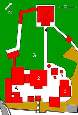 Voraus sieht man die Haupthalle (本堂 Hondō; 2). Dort wird die Hauptkultfigur, eine 1000-armige Kannon (木造千手観音立像 Mokuzō senju Kannon ritsuzō), aus Holz gefertigt, die „Yanagidani-Kannon“, verehrt. Sie soll, zusammen mit dem Wasser, bei Erkrankungen der Augen helfen. Zur Linken hat man den Abt- und Mönchsbereich (A) mit Speisesaal (庫裏 Kuri) und Abtresidenz (書院 Shoin), zur Rechten steht die Amida-Halle (阿弥陀堂; 3). Ein kleiner Pavillon (地蔵堂; 5) ist dem heiligen Jizō gewidmet. Dahinter, höhergelegen, findet man das Oku-no-in (奥の院; 4).