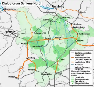 - ↑ Niedersächsisches Ministerium für Wirtschaft, Arbeit und Verkehr: „Dialogforum Schiene Nord“ beginnt in wenigen Wochen. Presseinformation vom 2. Dezember 2014.