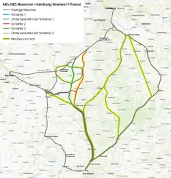 - Die Variante 2 sollte bei Tostedt aus der Bahnstrecke Hamburg–Bremen ausfädeln und südwestlich von Walsrode in südöstlicher Richtung auf Hannover zu verlaufen.[11]