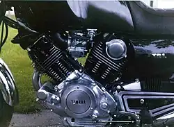 Prinzipiell gelten Zweizylinder als billiger bei der Entwicklung und Produktion sowie sparsamer beim Treibstoffverbrauch. Die Motorenentwickler Kunihiko Morinaga und Hajime Ueno setzten bei der TR 1 nicht auf den traditionellen Zylinderwinkel von 90 Grad, sondern konstruierten einen Motor mit um 180 Grad gegeneinander verdrehten Zylindern, die in einem Winkel von 75 Grad hintereinander stehen. Diese Bauweise sollte die Breite und Länge möglichst gering halten und damit auch einen kürzeren Radstand ermöglichen. Außerdem rotiert die querliegende und rückwärts laufende Kurbelwelle bei dieser Bauform ohne zusätzliche Umlenkung schon in der Richtung, die für den Antrieb der Kupplung benötigt wird. Die beiden Zylinder sind gleich und somit untereinander austauschbar, was die Ersatzteilversorgung vereinfacht. Je eine oben liegende, durch eine als Zahnkette ausgeführte Steuerkette angetriebene Nockenwelle steuert zwei Ventile im Zylinderkopf, jeweils eine Zündkerze wird von einer kontaktlosen Transistorzündung versorgt. Das Motorenkonzept „überlebte“ die Bauzeit der TR 1 in den von 1981 bis 2003 mit verschiedenen Hubraumgrößen angebotenen Virago-Chopper- und Cruiser-Modellbaureihen sowie ab 2001 im „Naked Bike“ BT 1100 Bulldog.