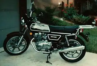 ![]() 1977 Yamaha XS500 mit einer Scheibenbremse vorn. Auf dem Seitendeckel DOHC 500=Double over Head Camshaft, doppelte obere Nockenwelle | |