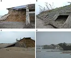 Die Yamamoto-Bucht bildete während des Tsunamis von 2011 einen besonderen Schwerpunkt für die im südlichen Teil der Sendai-Buchtküste in hoher Dichte aufgetretenen Küstendeichbrüche.[6] Die Yamamoto-Küste war bereits vor dem Tsunami stark erodiert, Es existierten keine Sandstrände.[3][4] Die Küste wurde durch einen Betonküstendeich und Betonbewehrungseinheiten geschützt.[3][4][1] In diesem Gebiet wurde der Küstendeich stark zerstört.[3][4] An mehreren Stellen entlang des Deckwerks kam es zu Brüchen im verstärkten Gitter und zum Verlust der meisten Betonblöcke.[1] Während des Tsunamis, der an der Yamamoto-Küste eine Auflaufhöhe von 19,2 m erreichte, bildete sich unmittelbar landeinwärts entlang des Küstendeichs ein großer durchgehender Graben von rund 50 m Breite, und die hintere Deichböschung wurde zerstört.[3][4] Untersuchungen nach dem Tsunami ergaben, dass die hintere Deichböschung einen Schwachpunkt der Küstenschutzbauwerke gegen lokale Unterspülungen hinter dem Deich darstellen, wenn der Tsunami die Höhe der Deichkrone überschreitet.[3][4] Die Auswaschung auf der Lee-Seite war eine Hauptursache für den Dammbruch.[1][5]