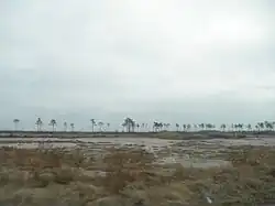 Der Tsunami zerstörte nicht nur den Küstendeich, sondern entwurzelte auch alle Bäume und riss sie landwärts mit sich.[3][4] Die Kiefern des Küstenwaldes wurden durch den Tsunami weitgehend zerstört, indem sie umgekippten und ihre Stämme sehr nahe am Boden umgebrochen wurden. Der Küstenwald erzeugte in der Folge erhebliche Mengen an Trümmern. Es konnte gezeigt werden, dass solche Trümmer strukturelle Schäden an einem 1 km landeinwärts gelegenen Stahlrahmen-Landwirtschaftsgebäude verursachten, das nicht nur seine Verkleidung bis in 4 m Höhe verlor, sondern beim Vordringen des Tsunamis auch von einem Baumstamm getroffen wurde, der tragende Elemente verbog.[1]
