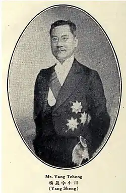 Yang Sheng war ein Mitschüler und Arbeitskollege von Yin-Chang und besaß gute Kenntnisse der deutschen Sprache sowie des Deutschen Reichs. Von 1903 bis 1905 war Yang Sheng Gesandter in Wien. Von 1905 bis 1907 war er Gesandter in Berlin. Am 6. November 1907 gehörte er zu den Gründungsmitgliedern der 广东省教育会 (Guangdong Gesellschaft für das Studium der Selbstregierung)[2] 1909 war er erneut Gesandter in Berlin. Nach dem Sturz der Qing-Dynastie leitete er in den Provinzen Shandong und Jiangsu Ämter im Polizeiwesen und fungierte mehrere Male als daoyin (Statthalter) des Bezirks Shanghai. Von 1924 bis 1927 war er Vizepräsident des chinesischen Roten Kreuzes.[3]