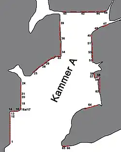 Die erheblich größere der beiden Kammern ist zu Anfang etwa 20 m breit und verjüngt sich, bis nach etwa 30 m die Wände aufeinandertreffen. Der Fußboden war ursprünglich gepflastert, im hinteren Teil von einer Stufe unterbrochen und stieg danach bis zur Rückwand leicht an. Die Felswände sind fast vollständig mit Reliefs versehen. Unterhalb der Reliefs sind teilweise aus dem Fels gehauene, teilweise aus Steinen gebaute Podeste, die vermutlich dem Abstellen von Weihegaben dienten.[1] Durch die Pflasterung mit Steinplatten, die heute sämtlich verschwunden sind, deren Höhe aber durch Anschlussstellen im Felsen rekonstruiert werden kann, lag der Fußboden der Kammer 50–60 Zentimeter höher als heute, sodass der damalige Besucher die Reliefs etwa auf Augenhöhe sah.[17]