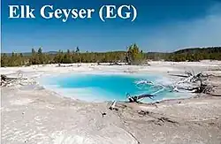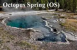 Der Park ist berühmt für seine vulkanogene Landschaft mit Geysiren, Fumarolen, Schlammtöpfen und heißen Quellen. 62 Prozent sämtlicher weltweit existierenden heißen Quellen liegen im Yellowstone-Gebiet, dies sind etwa 10.000, davon über 500 Geysire, somit hat der Yellowstone-Nationalpark die höchste Dichte an Geysiren.[7] Von diesen Geysiren im Nationalpark erfreut sich besonders der Geysir Old Faithful im oberen Geysir-Becken bei Touristen großer Beliebtheit, denn er spuckt sein Wasser in ungewöhnlicher Regelmäßigkeit in Abständen von etwa 80 bis 100 Minuten aus (Stand 2025). Mit dem Steamboat-Geysir beheimatet der Park auch den größten aktiven Warmwasser-Geysir der Welt. Er befindet sich im Norris-Geysir-Becken. Die größte heiße Quelle im Yellowstone-Nationalpark und die drittgrößte weltweit, die Grand Prismatic Spring, befindet sich im mittleren Geysir-Becken. Im unteren Geysir-Becken befinden sich u. a. der Great-Fountain-Geysir und die beiden Quellen Octopus Spring und Mushroom Spring,[8] der nordöstliche Ausläufer wird als Culex-Becken bezeichnet. Das größte Geysir-Becken am Ufer des Yellowstone Lakes ist West-Thumb-Geysir-Becken (mit Potts-Becken im Norden und Abyss Pool).