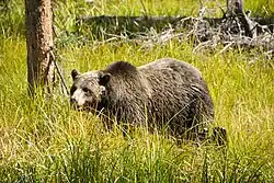 Seit 1886 ist der Grizzlybär im Yellowstone-Nationalpark geschützt. Von 1975 bis 2007 stand er auf der Liste der bedrohten und gefährdeten Arten des U.S. Fish and Wildlife Services und war somit auch außerhalb des Parks geschützt.[34] Heute leben über 500 Tiere im Park oder im angrenzenden Gebiet; 1975 waren es 136 bis 312. 2009 wies ein Bezirksgericht in Montana den U.S. Fish & Wildlife Service an, den Grizzly wieder auf ihre Liste der bedrohten und gefährdeten Arten zu setzen.[35]