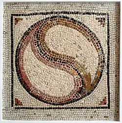 Ein Mosaik aus einer römischen Villa in Sousse (Tunesien) zeigt die durch eine „S“-Linie getrennten Hälften, allerdings ohne die Punkte.[8]