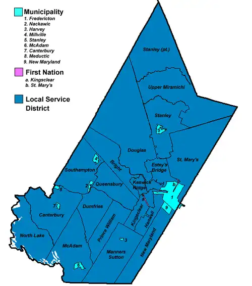 York County besteht aus acht Landkreisen und der Hauptstadt Fredericton (aufgelistet nach Einwohnerzahl - 2011 Census).