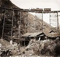 Der Trasse stellten sich in ihrem südlichen Teil, die die Ebene des Roten Flusses durchmisst, keine nennenswerten Hindernisse in den Weg. Der Bau des 104 km langen Abschnitts Hải Phòng–Hanoi wurde 1900 begonnen und am 1. April 1903 eingeweiht.[9] Zwischen Hanoi und Lào Cai stand der parallel zur geplanten Strecke fließende Rote Fluss als Transportweg für Material und Arbeiter zur Verfügung. Zwei Dampfschiffe und ein Kanonenboot stellten den „motorisierten“ Teil der dafür eingesetzten Schifffahrt dar. Hinzu kamen 50 einheimische Dschunken und 8000 Maultiere und Pferde.[10] Im Abschnitt nördlich der chinesischen Grenze musste die Trasse aber durch topografisch sehr schwieriges Gelände errichtet werden. So waren insgesamt 173 Brücken (davon 107 in China) und 158 Tunnel (davon 155 in China) erforderlich.[11] Die Strecke überwindet auf einer Länge von 855 km (davon 465 km in China) mehr als 2.000 Höhenmeter. Dafür waren Kurvenradien von nur 50 Metern und Steigungen bis zu 30 ‰ erforderlich. Am chinesischen Streckenkilometer 398 erreicht die Bahn mit 2097 m ihren höchsten Punkt.[12] Auch deshalb wurde für sie Meterspur gewählt. Hinzu traten politische Schwierigkeiten: Der Vize-König von Yunnan misstraute dem durch die Bahn wachsenden Einfluss der Europäer in seinem Herrschaftsgebiet und versuchte die Versorgung der Baustellen aus seinem Machtbereich zu verhindern.[13] Dies alles trieb die Kosten des Projekts drastisch in die Höhe: In der nur dünn besiedelten Gebirgsregion wurde so mit Kosten von 192.000 Francs pro Kilometer die teuerste Eisenbahnstrecke Indochinas verlegt.[14]