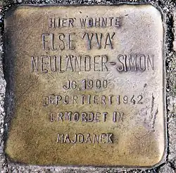 - ↑ Unter https://www.statistik-des-holocaust.de/list_ger_ber_ot14.html finden sich auf Blatt 4, lfd. Nr. 75 u. 76 die Namen von Else und Alfred Simon. Auch eine Erklärung für das oft falsch genannte Datum 13.6. des Transportes findet sich auf dieser Seite.