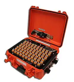 - Funkzündung, bei der nur Funkmodule verkabelt werden. Diese zünden per Funkfernsteuerung mit Signalen, die vom Steuerungszündgerät gesendet werden. Hierbei sind größere räumliche Entfernungen einfach zu überbrücken. Nachteilig erweist sich allfällige Störanfälligkeit des Funksignals und die hohen Investitionskosten. Autarke Stromversorgung der Module ist Voraussetzung. Vorteile sind die mögliche Nutzung von wassergebundenen Abschussstellen (Pontons), ohne dass sich ein Feuerwerker in der Abbrandzone aufhalten muss, oder in großen Bauwerkshöhen (Überdachung von Fußballstadien, Brücken, Hausfronten). Ende 2015 ist Stand der Technik, dass die Funksignale auf einer reservierten Frequenz und digital codiert gesendet werden. Sollte lokal ein zweites Funksystem auf derselben Frequenz betrieben werden, wird das erkannt und beide Systeme blockieren das Auslösen von Zündungen.[1]