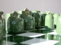 Im September 1996 wurde zur Offenen Deutschen Dameneinzelmeisterschaft, die der Dresdner Schachfestival eV. an der Elbe ausrichtete, erstmals ein arabisches Schachspiel aus Dresdner Porzellan ausgestellt. „Der 'Dresdner Porzellan-Cup' verband die Gegenwart mit der Vergangenheit und offenbarte dabei ganz besondere Verbindungen, die es zwischen der Stadt Dresden, der Kunst, der Religion und dem Schach gibt. Am 15. Januar 1708, gelang Johann Friedrich Böttger, Ehrenfried Walther von Tschirnhaus und Gottfried Pabst von Ohain in der Elbestadt die Erfindung des Europäischen Porzellans. Schon drei Jahre später sind Schachfiguren in Böttgers Produktionsliste verzeichnet. Das Schachspiel aus Dresdner Porzellan, wurde in der Sächsischen Porzellan-Manufaktur Dresden in der klassischen Technologie aus dem 18. Jahrhundert hergestellt. Die einfach gehaltenen Figuren muten zwar sehr modern an, aber ihre Geschichte reicht nach Arabien bis in das achte Jahrhundert zurück. Von Modelleur Olaf Stoy wurden sie eigenhändig in Museen vorhandenen Originalen nachempfunden, die seinerzeit in Elfenbein oder in Knochen geschnitten wurden. Der Grund für die stereometrischen und geometrischen Formen der Figuren ist die islamische Religion. Sie verbietet die Abbildung des Menschen und anderen Lebewesen. Da man zur damaligen Zeit in der arabischen Welt die Vorschriften des Korans streng befolgte, wurden die Figuren aus den drei Grundformen Kegel, Zylinder und schmaler rechteckiger Körper entwickelt. An den Figuren aus der Manufaktur wird deutlich, welche Techniken man damals zur Unterscheidung der einzelnen Figuren einsetzte. Sie wurden in verschiedenen Höhen flach abgeschnitten, an der ganzen Kuppe oder Segmentweise abgerundet, eingekerbt, mit knopfartigen Aufsätzen oder vorspringenden Wölbungen versehen. Die sächsischen Landesfarben weiß und grün entstanden durch den Zusatz von Farboxiden zu einem Teil der Porzellanmasse.“[2]