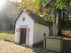 Laut einer Aufschrift über der Eingangstür wurde die Kreuzkapelle von Sebastian Haseney aus Wollbach und Kaspar Schmitt aus Zahlbach gestiftet und im Jahr 1735 erbaut. Zu der Kapelle gehören ein Kreuz (1960; als Ersatz für ein Vorgängerkreuz), Kreuzwegstationen (gestiftet im Jahr 1826 vom Zahlbacher Gastwirt Michael Albert und seiner Ehefrau Anna Albert) sowie eine Marien-Grotte (gestiftet im Jahr 1951 vom Zahlbacher Tierarzt Franz Wehming und seiner Frau Anneliese Wehming).