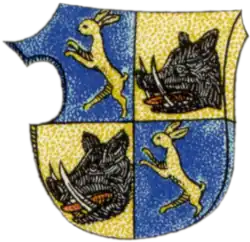 Geviert, 1 und 4 in Blau ein rechtsgewandter, aufrecht zum Sprung geduckter goldener Hase; 2 und 3 in Gold ein rechtsgewandter abgeledigter schwarzer Eberkopf mit blutiger Schnittfläche, ausgeschlagener roter Zunge und silbernen Stoßzähnen (Stammwappen der Buzici).