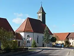Die evangelische Dorfkirche wurde 1781 anstelle der 200 Jahre alten Vorgängerkirche erbaut und ist mit ihrem Dachturm sowie ihrer beeindruckenden Kassettendecke ein sehenswertes Bauwerk. Sie wurde von Kirchenrats-Baumeister Wilhelm Friedrich Goez aus Ludwigsburg erbaut.[4] Die Dorfkirche steht unter Denkmalschutz und ist eine der wenigen Kirchenbauten der Region, die mit einer Solarstromanlage ausgestattet sind (seit 2007).[5]