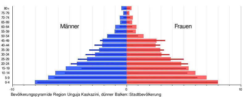 Die Bevölkerungszahl stieg von 96.989 im Jahr 1988 auf 136.639 im Jahr 2002 und weiter auf 187.455 im Jahr 2012. Das bedeutet, dass die jährliche Wachstumsrate von 2,4 Prozent auf 3,2 Prozent gestiegen ist. Die Gesamtbevölkerung zeigt den für viele afrikanischen Regionen typischen hohen Anteil an Jugendlichen. Betrachtet man nur die Stadtbevölkerung, so zeigt die Ausbuchtung bei den Zwanzig- bis Neunundzwanzigjährigen eine Zuwanderung in dieser Altersgruppe an.[7]
